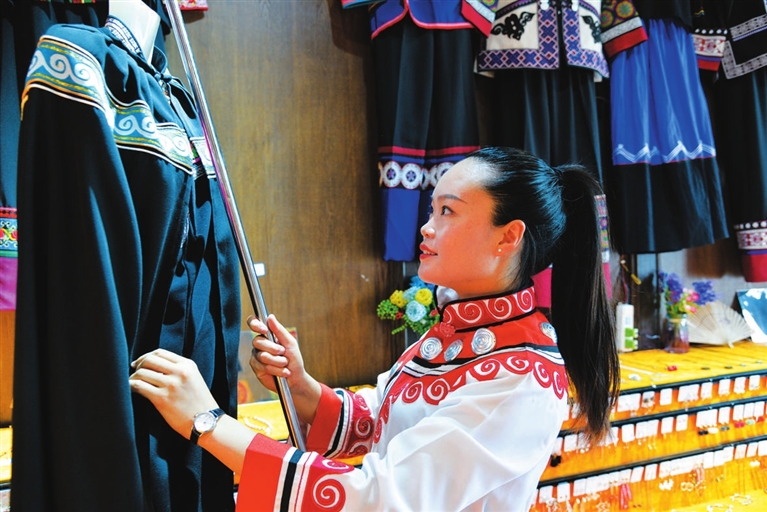 早上9点,贵州省毕节市大方县奢香古镇的聚民艺服饰扶贫车间内已聚集了不少学徒,从不到20岁的年轻女孩,到年过花甲的彝族老人,都在聚精会神地跟着“小龙师傅”学习手工艺品制作技术。