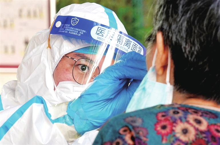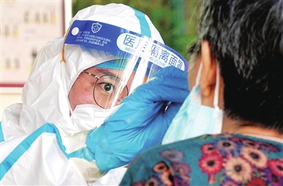 近日,在河南省郑州市新冠肺炎疫情防控一线,医务人员为市民进行核酸检测取样,志愿者在高速路口、火车站进站口,提醒市民遵守防疫规定,查验核酸检测结果……这些在炎炎夏日里坚守的身影,组成一道疫情“封锁线”。 新华社 发