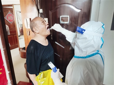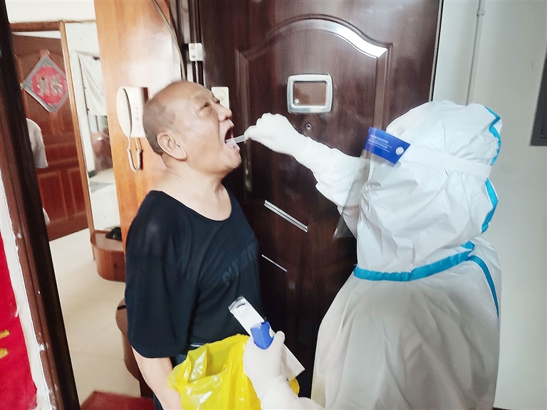 “大爷,您仰起头,喊‘啊’,别紧张!”身穿防护服的市二院手术室护士李文婧身体半蹲,引导坐在椅子上的老人配合采样。“下一户在哪?”结束采样后,李文婧询问一同入户的社区志愿者。上楼、下楼,再上楼、下楼……几户上门采样跑下来,被防护服紧紧包裹着的李文婧感觉腿有些发软,稍作喘息,又奔赴下一户。
