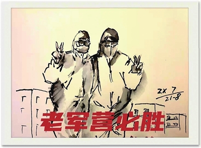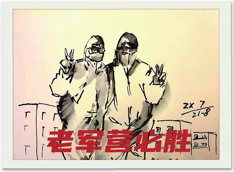 老张便想到,画幅漫画帮助家人和朋友放松心情。他拿起钢笔,寥寥数笔,十几分钟便画出两位防疫人员的形象。他们穿着防护服,虽然面罩遮住了面部,但从他们比出的“胜利”手势看,信心跃然纸上。画完后,老张又用电脑在画作上加了五个红色字体“老军营必胜”。