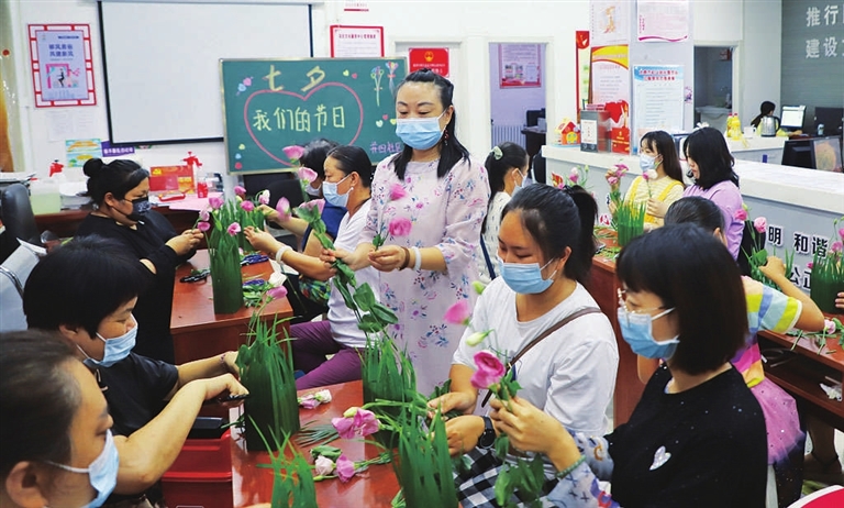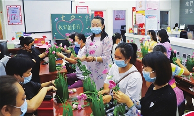 8月14日是七夕,迎泽区桥东并四社区开展“‘巧手七夕·花情永丰’我们的节日”活动。社区邀请专业老师向居民传授插花技艺。