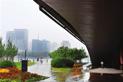 8月19日,一场降雨滋润了并州大地,漪汾桥下,市民一边躲雨锻炼,一边享受着舒爽的天气。