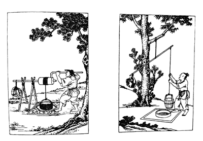 我的童年在平遥乡下度过。合作化前,我的二爷爷家在村外叫“瓜堉”的那片地里有一块菜地,菜地里有水井。需要浇水了,二爷爷就和他的儿子、我的五叔扛着辘轳、提着柳罐去,在井口上架起辘轳,井绳一端固定在辘轳把上,再在辘轳上缠绕,柳罐下到井里,待水满,再摇着辘轳把它提上来,顺势往井口旁的石槽里一倒,那水便冲出水槽出口顺着小渠流向一畦一畦或长着辣椒、或挂着黄瓜、或栽着茄子的菜地……在平遥老家,也称柳罐为栲栳。
