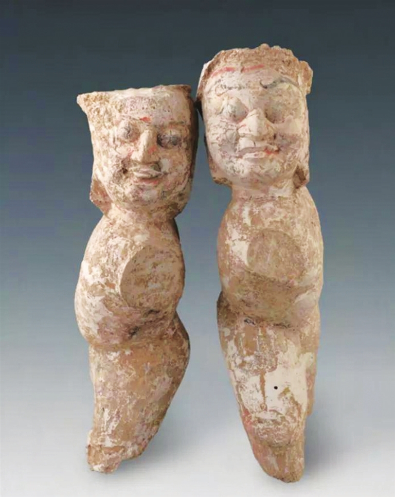 该墓随葬器物种类丰富,特征鲜明,包括陶器、釉陶器、石器、铅器、铜器、银器、漆器、木器等。部分器物可作为同类墓葬出土器物断代类比的标准器,木镇墓俑、镇墓兽和彩绘陶器尤为特别。以往北魏墓中发现的武士俑、镇墓兽,有的为图像,有的为石质或陶质,木质者尚属首次发现,此或与墓主籍里的丧葬传统有关。其中,木镇墓俑有2件,木雕而成,头戴兜鏊,粗眉弯曲,双目圆睁,尖鼻高耸,嘴角宽厚,“八”字胡;上身前倾扭胯,四肢残,前腿微屈;面部眉、眼、胡须涂黑彩,其余部分均涂红彩。木镇墓兽1件,人面兽身,头部略下垂,高阔鼻,嘴角上扬;前肢直立,后肢屈蹲,后肢前端与前肢相连;面部涂红彩,其余部位涂黑。