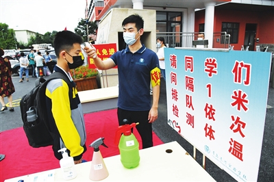 8月29日,青岛通济实验学校学生返校时在校门口间隔一米排队,测量体温入校。