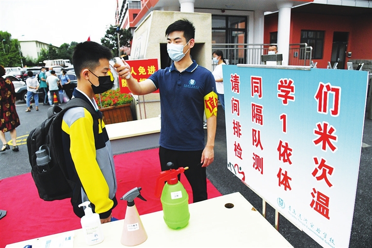 当日,山东省青岛市部分学校迎来返校日。根据青岛市疾控中心要求,学生均在开学前进行了连续14天每日体温监测,并主动及时向学校报备健康状况和活动轨迹,做好开学入校健康检查。 新华社 发