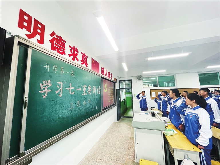 进山中学组织学生们重温了习近平总书记“七一”重要讲话,同时,还安排学生们在赵宗复纪念馆、航天实验室、学术报告厅、教室楼道等校内多个地点,齐诵《请党放心,强国有我》“七一”集体献词,在这段浓缩了中国共产党百年历史的献词中,青年学子们喊出了振兴中华的铮铮誓言。