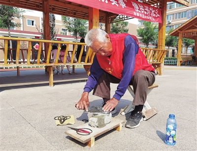 年过八旬的赵海珠,一头白发,身体硬朗,穿着印有“南寨街道兴安苑社区志愿者”的红马甲,脸上挂着慈祥的笑容。邻居郭大妈递来一把旧菜刀,他接到手中端详了一番,俯下身子,放稳磨刀石,往上面淋了点清水,然后一手握紧刀柄,一手扶好刀头,专心致志地开始打磨,还时不时地停下来,用指腹轻刮刀刃,检验成果。一会儿工夫,这把菜刀变得锋利如初。