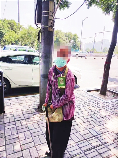 9月2日上午,记者在胜利桥东终于见到了这位“时髦”乞讨者的真容。不高的身材,走路有点跛,拄着拐杖,身上挂着一个帆布包,右手捏着一些零钞,最醒目的就是挂在胸前的微信收款二维码。