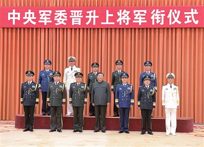 晋衔仪式在嘹亮的军歌声中结束。随后,习近平等领导同志同晋升上将军衔的军官合影。