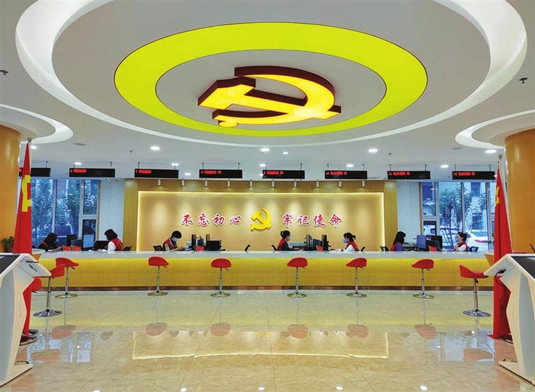 新投入使用的青运党群服务中心让人耳目一新。进入一层党群服务大厅,只见一枚党徽悬挂在天花板,“我们希望,每一个走进来的党员群众,都在党的光辉照耀和引领下,跟随党的脚步。”工作人员介绍道。