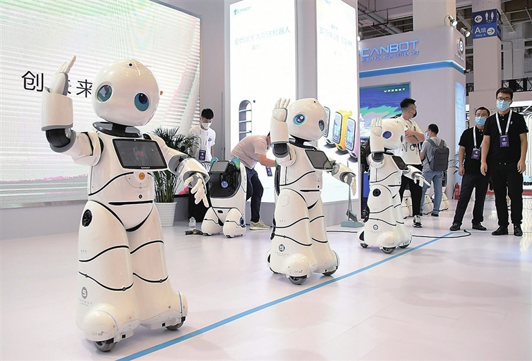9月10日,在2021世界机器人博览会现场,服务机器人在跳舞。