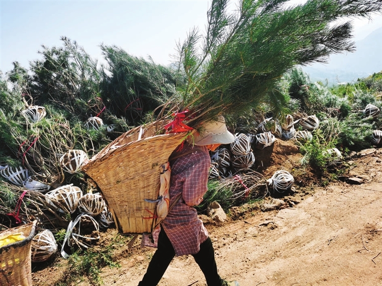 “一辆车上大约有200株树苗,每株都有三四十斤重,都要一株一株背到指定的地点。”郝焕青说,一天时间内,每个人差不多要背五六十株,有时树苗送的多,他们凌晨三四点就上山了,一次就得背三四株,吃饭休息都在山上。