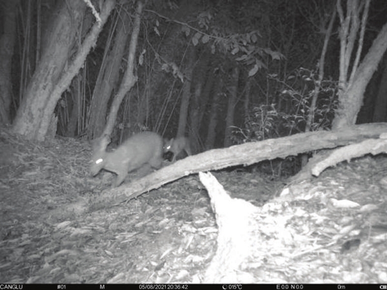 红外相机拍摄到的画面显示,两只四足动物一前一后从林子里走出来,其中的幼崽朝着镜头蹦蹦跳跳走过来,萌态十足。野生动物保护专家、云南省昌宁县林业和草原局高级工程师戴晓明根据拍摄照片中两只动物颈部两侧各有一条较宽的白色带纹以及它们的耳朵、四肢形状等判断,确定它们为一对林麝母子。