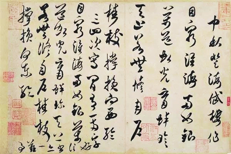 关于“月神”的神话,在唐代出现新内容——月宫中除了嫦娥、蟾蜍、玉兔外,又增添了吴刚这一人物,体现出唐人的浪漫主义情怀。米芾在《中秋诗帖》中引用了“吴刚伐桂”这一典故,谈到若非吴刚日复一日不停砍伐桂树,快速生长的桂枝必定撑破月轮,以此暗喻仕途常为人阻,才华无法施展。