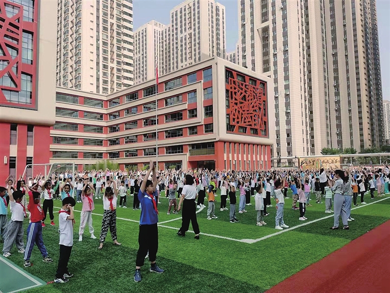 课间操时间,操场上传来欢快悦耳的音乐“你笑起来真好看,像春天的花儿一样”。与之相伴的是整齐的拍手声和跺脚声。操场中间,8名体育教师带领全体学生跳跃着轻快的步伐,欢度愉快美好的体育时光。