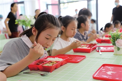 11时30分,孩子们排着整齐的队伍,陆续进入餐区。香卤鸡腿饭、土豆片过油肉、青菜豆腐羹……打开餐盒,香气扑鼻,“欧耶,有我最爱吃的鸡腿”“老师,再来碗红豆米饭”,孩子们胃口大开。并州饭店办公室主任罗智慧轻声问:“学校的饭好吃吗?”二年三班的邓悠然喝了一大口汤,嘴巴油光光地说:“和我妈妈做得一样好吃。”