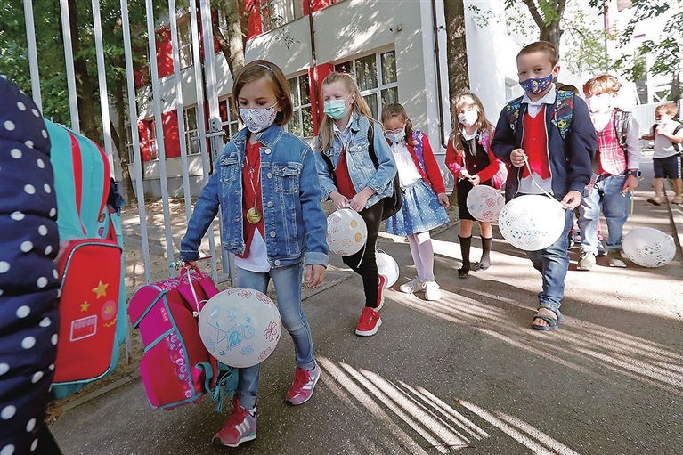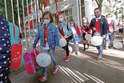 9月13日,在罗马尼亚首都布加勒斯特,学生进入学校参加新学期开学典礼。当日,罗马尼亚全国中小学开学,由于疫情日趋严重,政府要求所有人员必须戴口罩。 新华社 发