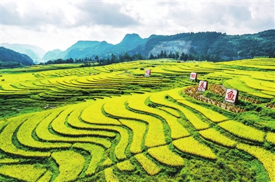 连日来,贵州省黔南布依族苗族自治州龙里县湾滩河镇天气晴好。水稻成熟,田野镀金,农民抢收稻谷,一片丰收景象。 新华社 发