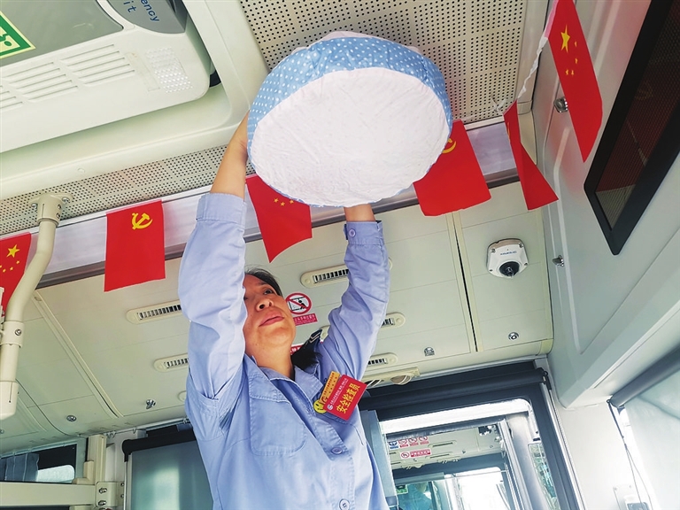 随着天气转凉,公交车驾驶室上方的风扇闲置了。如果长时间不用,灰尘会聚集在叶片上,清理非常困难。为此,李灵计划缝制防尘罩,给风扇穿上衣服。有了想法,她立刻行动起来,先买来各种颜色的布料,接着利用业余时间,缝制成了11个漂亮的风扇防尘罩。每一个防尘罩的颜色都不同,她希望既能防止灰尘,又能装饰车辆,并给乘客带来愉悦的心情。