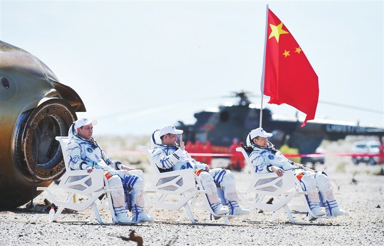 9月17日,神舟十二号载人飞船返回舱在东风着陆场成功着陆。这是航天员聂海胜(中)、刘伯明(右)、汤洪波安全顺利出舱。 新华社 发