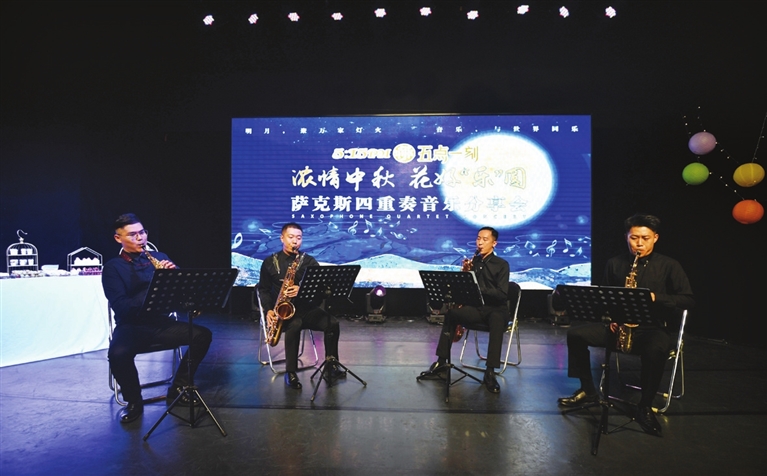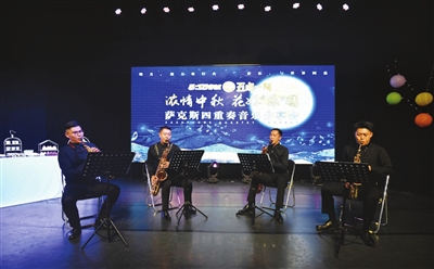 9月20日晚,“浓情中秋,花好‘乐’圆,山西首创萨克斯四重奏音乐分享会”在青年宫演艺中心小剧场上演。本场演出由崛围萨克斯四重奏乐团出演,也是山西首个萨克斯四重奏乐队。此次音乐会精选十余首经典曲目,让观众感受到萨克斯的音乐魅力。同时,《见笑喜剧“石在有意思”石磊脱口秀专场》在青年宫演艺中心大剧场上演。 牛晨阳 摄