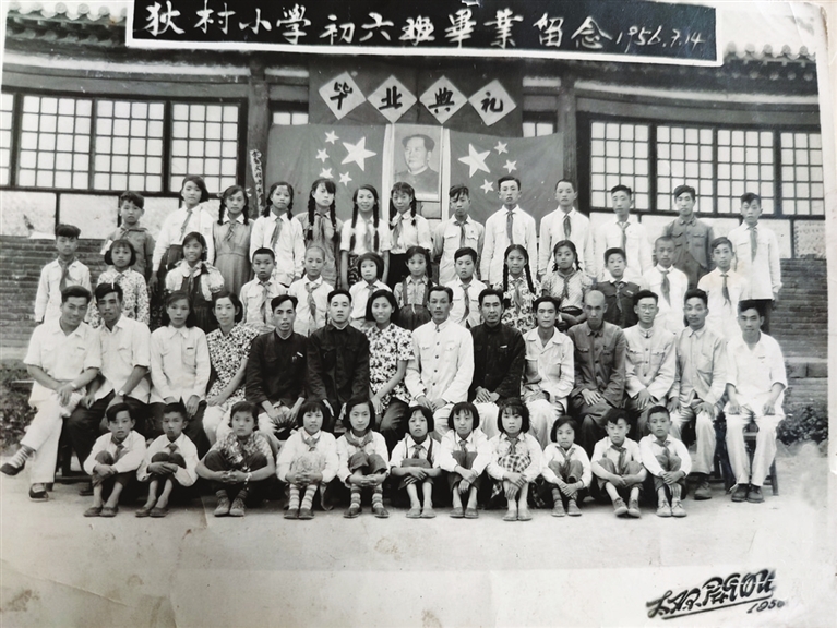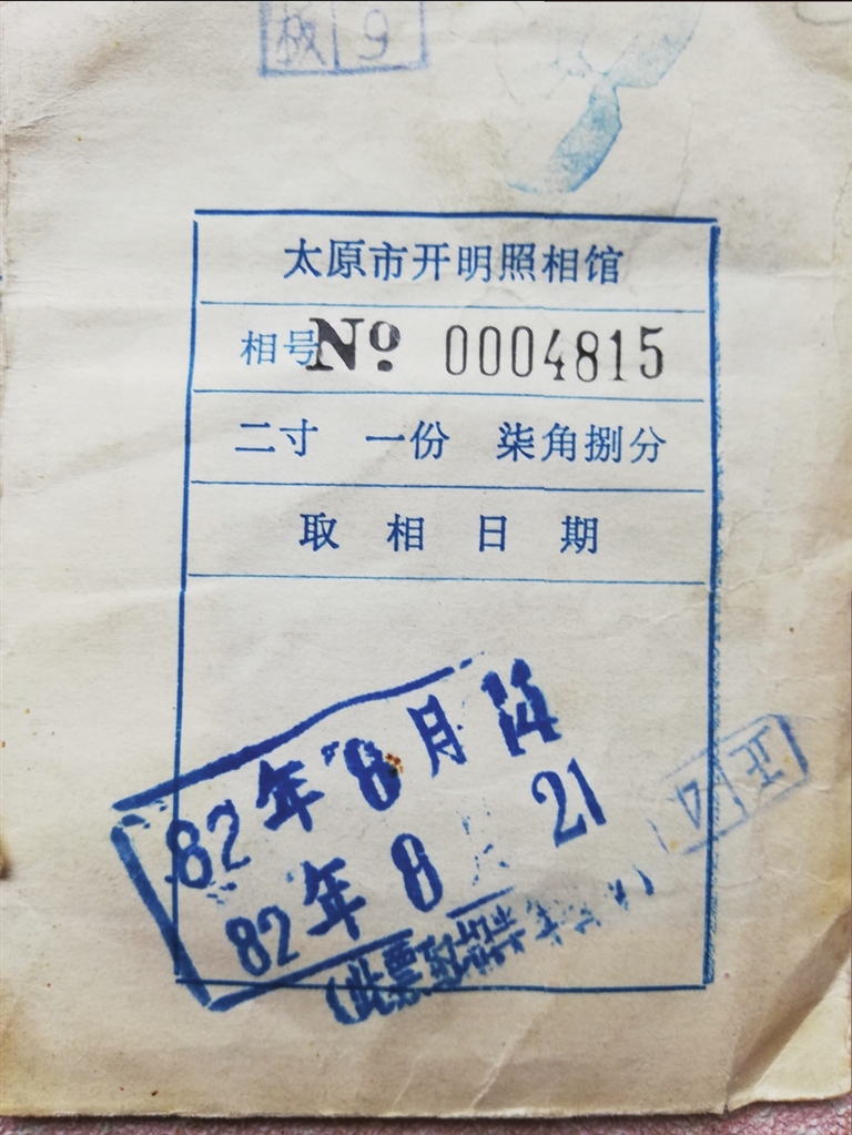 老爸与钟楼街结缘于65年前。1956年7月,他在狄村小学初小毕业。狄村是唐朝名相狄仁杰故里,狄村小学就在狄村正街东一公里的高阳寨奶奶庙。初小毕业是件大事。7月14日,学校几乎全部教职工——从校长到管事务的老师全部参加了“狄村小学初六班毕业留念”拍照。拍照地点在庙里一进院的主殿前。请的是哪家照相馆的师傅呢?老爸不知。2012年6月8日,时年68岁的老爸去看望年高79岁、当年他们初六班的班主任李培贞老师时,李老师郑重地把这张“毕业留念”照交给了他,老爸惊喜不已:这张照片的右下角印着“太原開明”,还有“1956”的字样。老爸说,狄村小学在太原城南5公里,这张“毕业留念”可是在钟楼街上的开明照相馆师傅跑了老远给他们拍的呀。