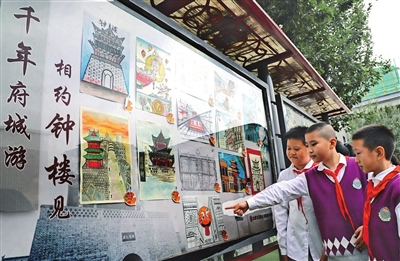 9月24日,校尉营小学举办“千年府城游,相约钟楼见”主题少儿绘画展,孩子们用画笔描绘出钟楼街的建筑和街巷,家乡美景跃然纸上。 张昊宇 摄