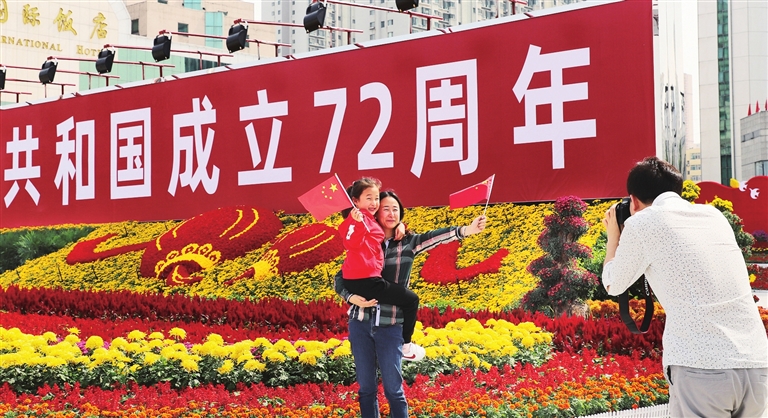 9月27日,五一广场南广场摆放的大型国庆花坛分外鲜艳。临近国庆,我市各个广场、公园精心准备,对景区绿化进行了全面检查和重点提升,“梳洗打扮”喜迎国庆,为市民营造了浓浓的节日氛围。 张昊宇 摄