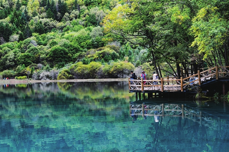 新华社 发 在四川省九寨沟景区,游客在五花海观景平台上拍照留念(9月27日摄)。