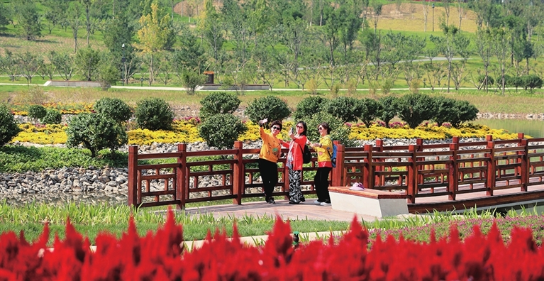 由于是工作日,开园首日并未出现过度“火爆”场面,这也正是将开园日期定在国庆节前一天的初衷。景区的第一批游客基本以有闲的退休人员为主,老年骑协的、广场舞协会的……各种老年团体,足足有十多个,他们自发组织起来,穿着各自团队统一的服装,在新建成的湿地公园内尽情畅游。