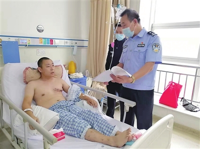25天前的晚上,张崇虎在街头抓捕一名偷盗手机的男子时,左胸心口、左腹部被捅伤,脖子、左手腕、左腿等处也被歹徒划伤。紧急送医后,大夫经过6个多小时的手术,才将他从死神手中抢救过来……