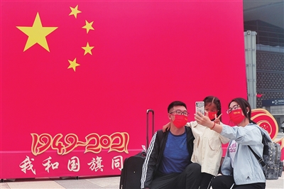9月30日,旅客在“我和国旗同框”的造型前合影留念。太原南站枢纽站前广场装扮一新,庆祝祖国72周年华诞。 李学军 宋卫东 摄