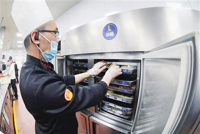 蔬菜加工、米饭炊焖、肉类加工、蔬菜烹饪……在基地的中央厨房生产区,听不到勺碰锅沿的叮叮当当,更没有呛人的油烟味道,有的只是蓝色消毒防护服、一次性口罩和严格的操作流程,智能化的烹饪机器。与其说这是厨房,其实更像高科技的生产车间。