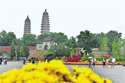 10月3日, 尽管天空还下着绵绵秋雨,但仍然阻挡不了游人观赏菊花的兴致。国庆假期,以“锦绣太原城 菊颂百年史”为主题的菊花展在双塔公园开展,各式花坛造型新颖别致,令前来赏菊的游客目不暇接、赞不绝口。 记者 梁琛 邓寅明 摄