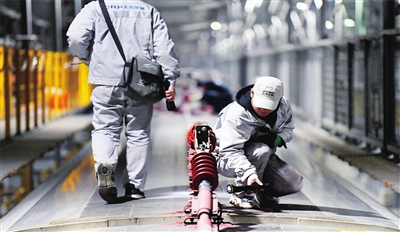 10月6日,太原车辆段动车组运用所的机械师们假日里坚守在一线岗位,对动车进行全面细致的“体检”,严格按照“零故障出库、零故障始发、零故障值乘”的作业标准,确保国庆节期间动车组健康上线安全运行。 记者 韩双喜 摄