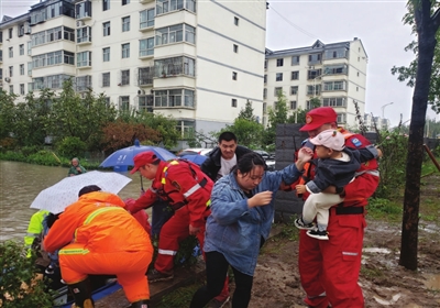 35名队员携带两艘动力冲锋舟和4副桨板在积水中展开救援。队员们以楼为单位,在各楼各单元前大声呼喊,提示有撤离需求的居民到单元门口等待救援。队员们全程保护,有序地将被困积水的居民转运至小区南侧公园的高处,居民们再自行离开。从上午9时至下午4时,35名队员连续作战,将百余名居民转运出小区。