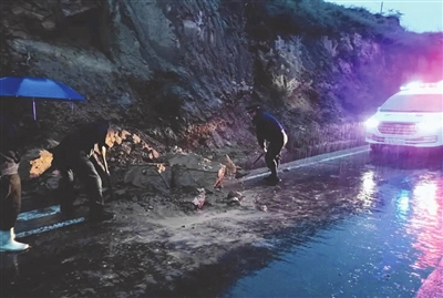 为确保道路交通安全畅通,娄烦县公安局交警大队全员上岗,克服雨天恶劣天气带来的困难,对辖区易积水路面、施工路段、急弯陡坡等路段开展全面排查,全力排除道路安全隐患,营造安全畅通的交通环境。交警大队还与派出所联合,加强对重点路段、重点部位的巡逻力度,加强监测预警和巡查排险,对发现的塌方落石路段迅速清理,确保过往车辆行车安全。10月5日上午,民警巡查至范家村隧道附近时,发现有碎石从山上滑落,迅速停车清理。