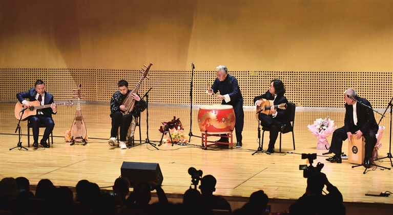 10月5日晚,2021方锦龙《无论西东》音乐会在山西大剧院举行。音乐会现场,方锦龙不仅用中外管乐器阐述音乐的起源和变迁,更用一把五弦琵琶演绎世界各地风情,带观众展开一场穿梭于东西方的音乐之旅。 记者 邓寅明 摄