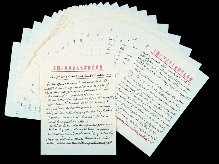 1966年11月12日是孙中山先生诞辰一百周年纪念日。中共中央决定在人民大会堂召开纪念大会,请宋庆龄撰写纪念文章并出席、讲话。对这篇讲稿,宋庆龄非常重视,花费很长时间精心准备,还专门请好友爱泼斯坦对英文稿进行润色修改,最后请周恩来总理修改中英文稿。