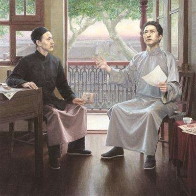 画面上,毛泽东在董必武所住房间内(博文女校内),拿着一份文件谈论着,董必武坐在一侧注视着毛泽东。阳台外可以看到对面的石库门建筑,背景是当时上海的城市轮廓,远处依稀可见该时期的大世界与外滩的万国建筑群等标志性建筑。画面中呈现的书籍典著,包括《共产党宣言》《新青年》杂志等建党初期的代表性文献,背景中两棵法国梧桐的交织象征了建国伟人们的友谊与理想的蓬勃生长。