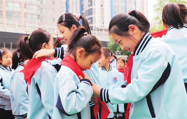 10月13日上午,杏花岭区五一路小学在操场举行“红领巾心向党 光荣的委托”2021年新生入队仪式。当日是少先队建队72周年纪念日,我市各个小学开展丰富多样的主题队日活动,立志传承红色基因,赓续红色血脉,争做社会主义建设者和接班人。 张昊宇 摄