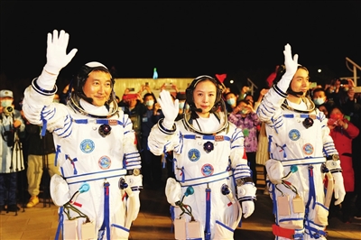 10月15日晚,神舟十三号载人飞行任务航天员乘组出征仪式,在酒泉卫星发射中心问天阁广场举行。翟志刚(左)、王亚平(中)和叶光富即将开启为期6个月的飞行任务。 新华社 发