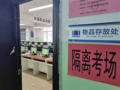 走进实训楼,一条长长的隔离线将一个“特殊”考场分隔开来,里面电脑正常开启,却空无一人。门口是两名穿着防护服的监考员,正在严阵以待。