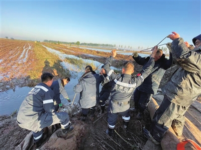 为了更好地排涝,队员们跳进湍急的洪水中,寻找最佳排涝口;寻找洪水去路,又不能危及下游,队员们只好趟过洪水向更远处寻找;受灾群众外出或者想返回取衣物,队员们用身体挡在危险地带,把自己站成了路标……