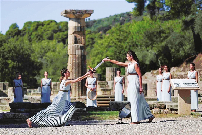 当日,北京冬奥会火种在奥林匹克运动的发祥地——希腊伯罗奔尼撒半岛的古奥林匹亚采集成功。在有着两千多年历史的赫拉神庙遗址前,奥运火种再次为北京点燃。 新华社 发