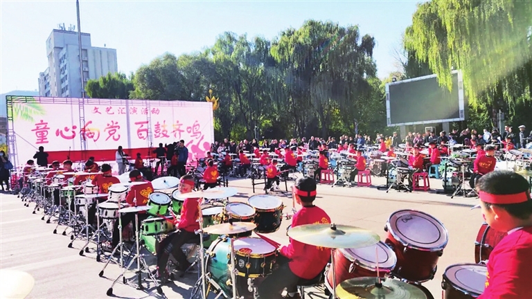 10月19日,古交青年路社区联合共青团古交市委开展了“童心向党、百鼓齐鸣、绘画美好山河”社区青春文艺活动。参加活动的近百名中小学生架子鼓表演者,在场地上摆出“100”的字形,庆祝党的百年华诞。 记者 刘志刚 摄
