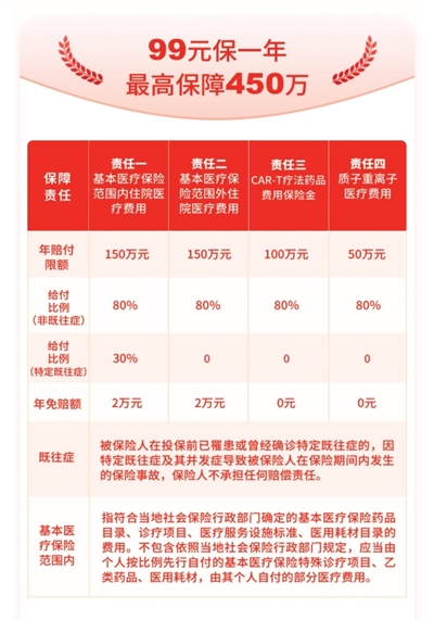 “万户健康保”紧密衔接基本医保,保障责任涵盖医保目录内外四重保障:一是基本医疗保险范围内住院医疗费用保险金,最高保额150万元;二是基本医疗保险范围外住院医疗费用保险金,最高保额150万元;三是CAR-T疗法药品费用保险金,最高保额100万元;四是质子重离子医疗保险金,最高保额50万元。