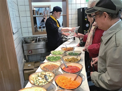11时30分,食堂开门迎客。73岁的刘小云和80岁的老伴杨宗义点了两碗茄子小炒肉饸饹面,加了免费的黄瓜丝、葱花、香菜、蒜。“这碗面,足有四两,售价每碗8元,社区老年人享受9折优惠,每碗7.2元。”刘小云高兴地说:“以前,常为做饭、吃饭发愁,自从有了社区食堂,我们几乎天天来这儿吃饭,省心、省事,好吃不贵。”