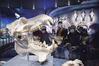 在博物馆大厅高高的“化石墙”上,记者找到了一枚三叶虫化石。讲解员告诉记者,这种长着坚固甲壳、在寒武纪广泛存在的生物,在约2.5亿年前的二叠纪末期已经灭绝。